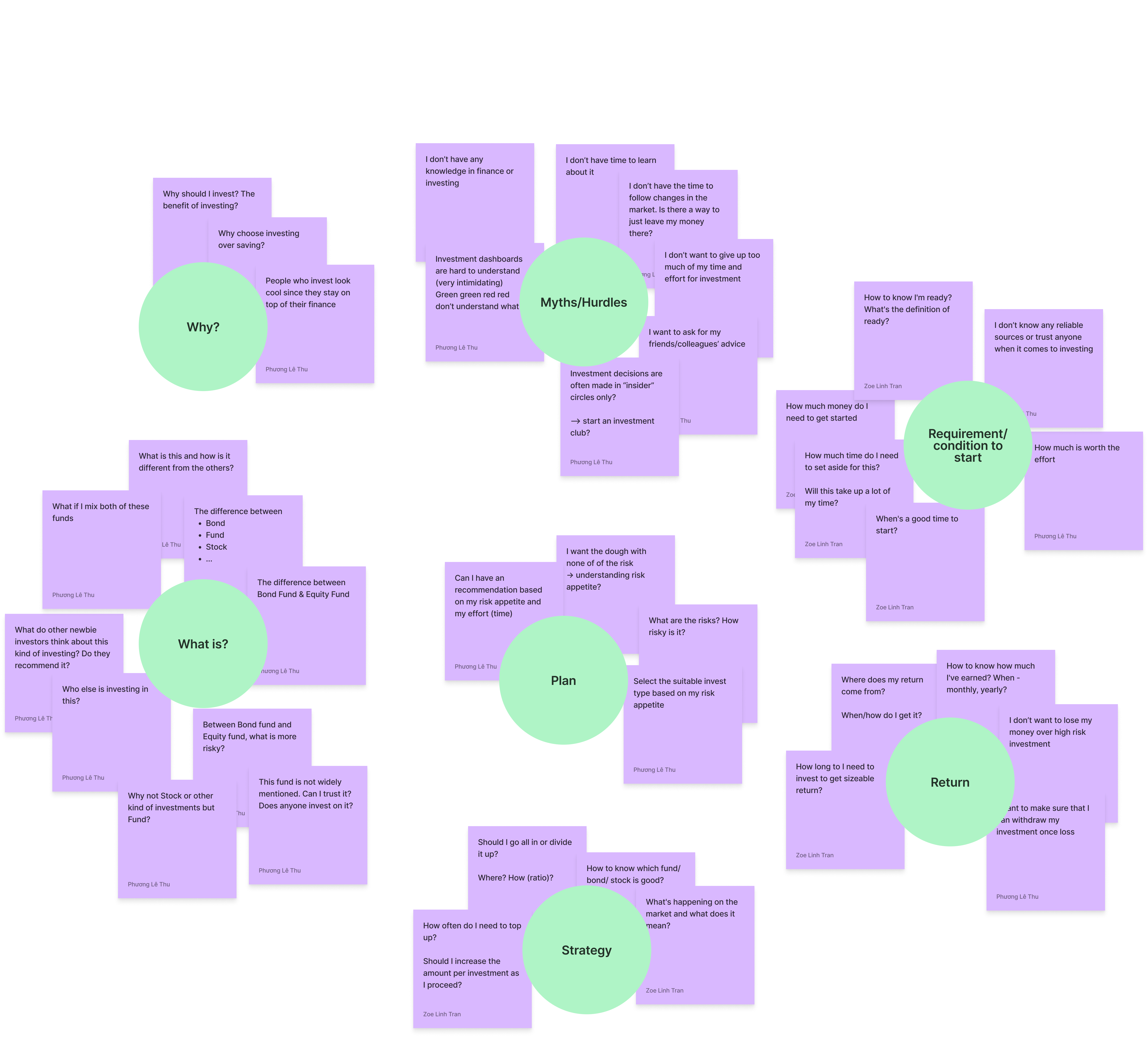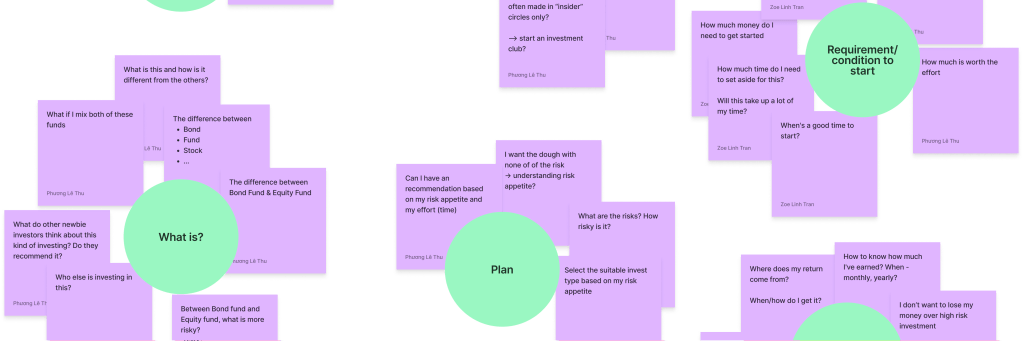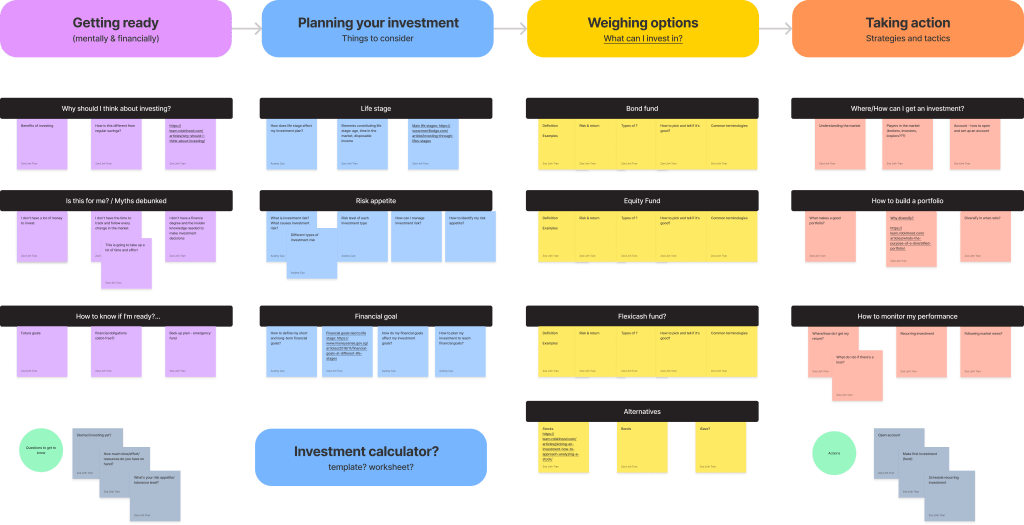 Working closely with the UX Designer, I began with an ideation workshop with potential investors within the team to identify promoters, detractors as well as their overall mindset when it comes to investing.