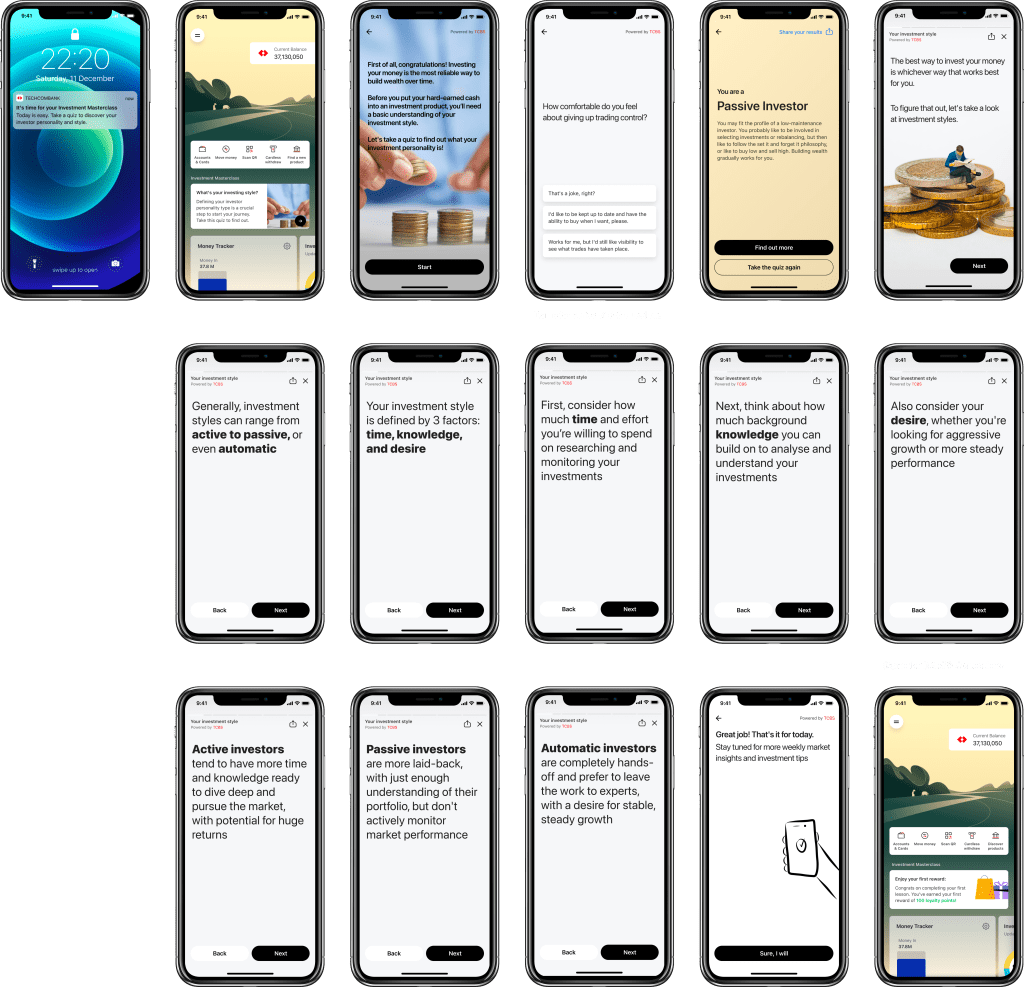 We developed a 8 learning modules to be covered in the course of 4 weeks. Each module delves into a specific topic in investing and includes 3 levels of interaction: learning – action – variable reward, following the Hook Model for habit forming.